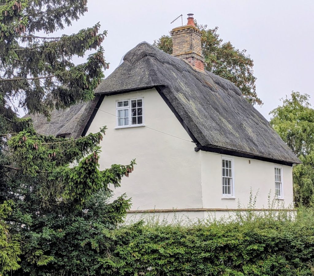 Farmhouse. Late C17. Timber framed, rendered and reed thatched, half hipped roof.