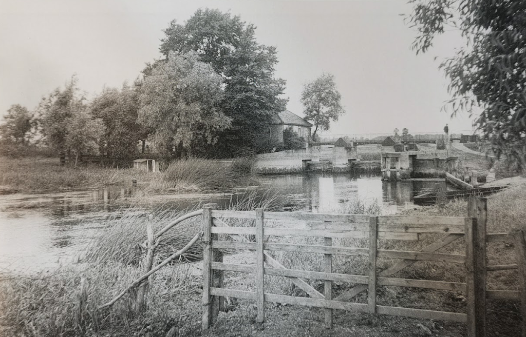 The tide flows up the New Bedford river as far as here. The staunch was constructed in the 1830s to raise the level of the river to allow boats to pass over the shoals. By 1948 the foundation of the Boat Inn had been broken up by constant flooding so it was demolished and replaced with a hut for the sluice-keeper.
