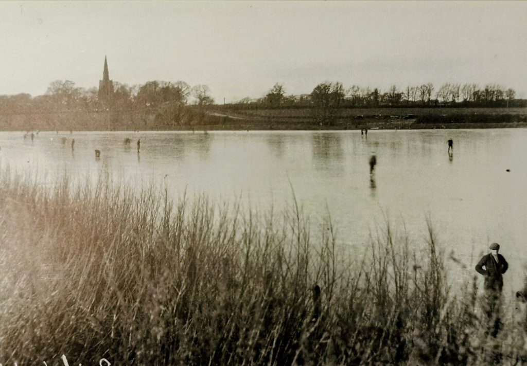 Bury Fen, Earith with view of Bluntisham church. The Fen was deliberately flooded in the winter to allow for skating. (Camb Collection; D G Reid)