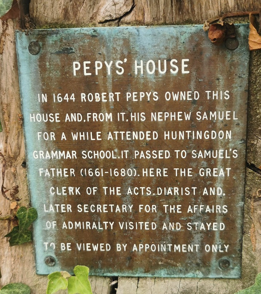 Samuel Pepys probably stayed here with his uncle. On the uncles’s death, Samuel’s parents moved into the house. The house appears frequently in the diary. In October 1667 he recovers most of a hoard of gold coins he had buried in the garden.