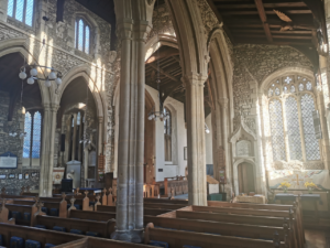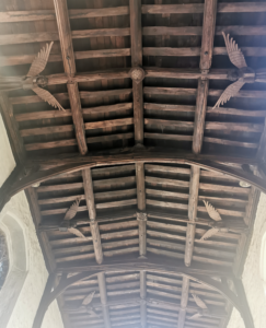 1435 – 1440 church rebuilt by Bishops Gray and Alnwick of Lincoln. Carved wooden angels of chncel ceiling date to late 1430s. they are carved showing a lute, viol, shawm, dulcimer and hurdy-gurdy.