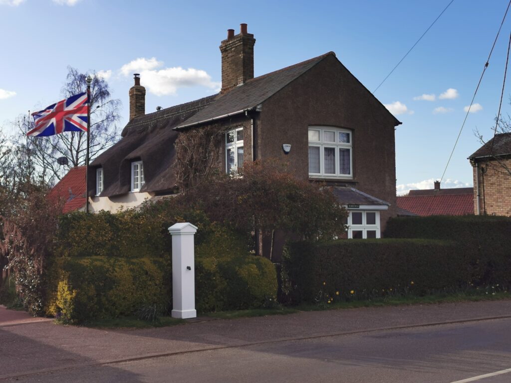 Of cottage, partly demolished for C19 two-storey extension to the east. Timber- framed and rough-cast with a thatched roof and two ridge stacks.
