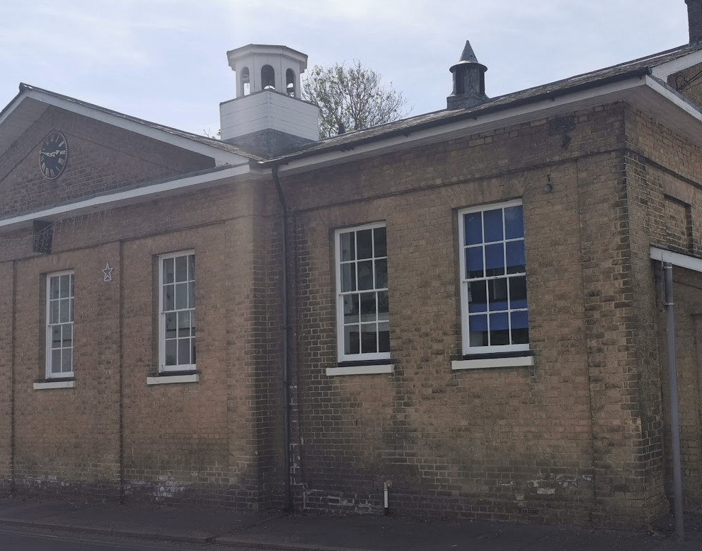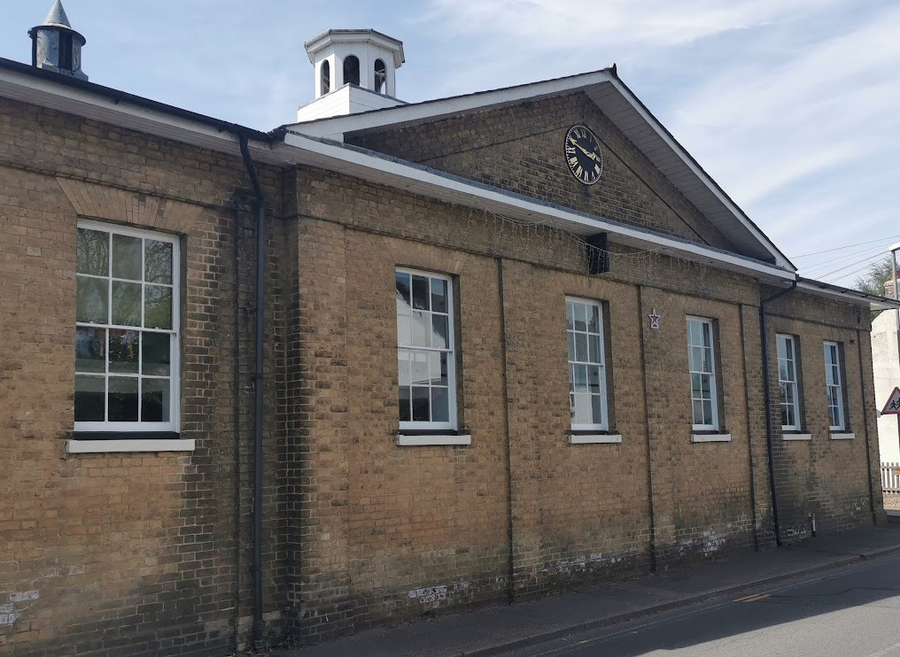 Built 1839. Gault brick, low pitch slate roofs with central wooden bell tower with octagonal arcade, lead roof and finial.
