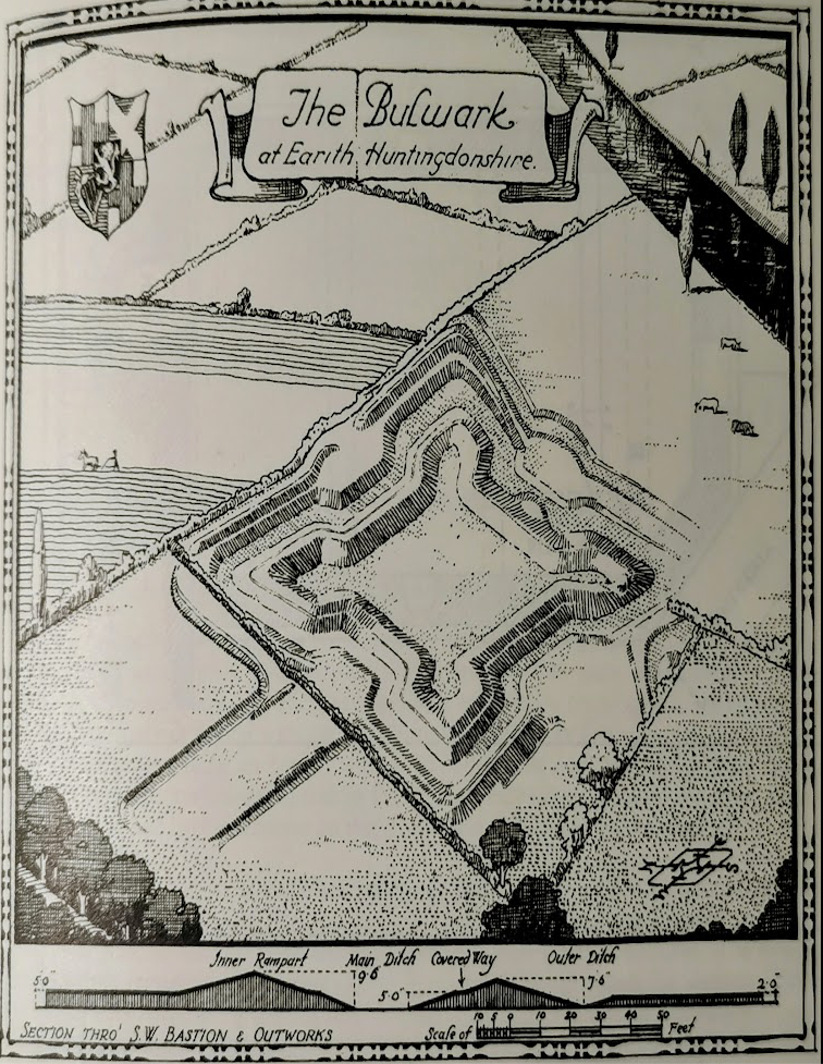 The Bulwark was strategically placed to command an important river crossing at the western end of the fen causeway which linked Huntingdon to the the Isle of Ely; and to control traffic on both the River Great Ouse, and the earlier of the two artificial navigations (the Old Bedford River), constructed by the engineer Vermuyden in the 1630’s. The monument includes the fieldwork with its square inner enclosure, corner bastions, perimeter defences and outworks; and a small steel-domed gun emplacement positioned within the earlier fortifications during World War II.
