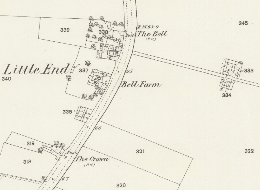The paper includes a brief history. In 1799 Little End was a hamlet which included a public house, The Bell. By the mid-19th century there was a collection of houses on the west side of the Great North Road between two pubs, The Crown, to the south, and a different Bell inn to the north, with Bell Farm half way between the two. The Crown public house was built in the 17th century; initially a private dwelling, it was licensed in 1816 and survives into the 21st century.