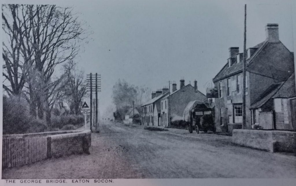 Bridge over Duloe Brook, foreground, Great North Road, Eaton Socon c.1915The George and Dragon has a Motor Bus parked outside, a service run by Mr Hinsby from c.1916.
