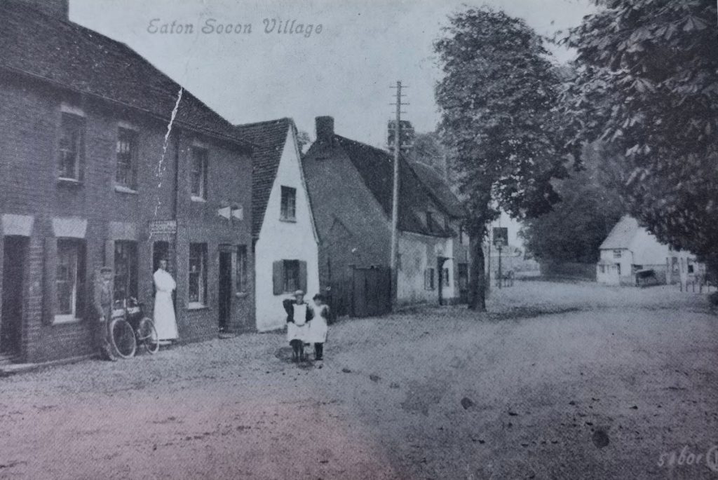Waggon and Horses, centre, Eaton Socon c.1900. The Sun is white building, far right.Do you have any information about the people or places in this article? If so, then please let us know using the Contact page or by emailing capturingcambridge@