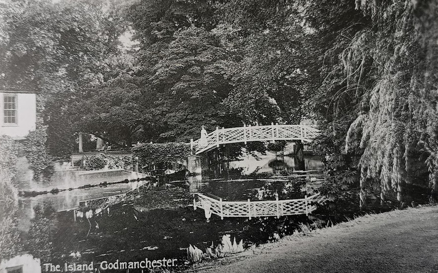 The Island, Godmanchester, 1916A Chinese style bridge connected the grounds of the 18th century Island Hall with an island.