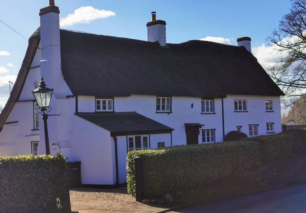 C17 timber framed and plastered farmhouse with later extension to east. (Historic England)