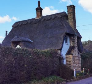 Early C18 cottage, timber framed and plastered with red brick foundations. (Historic England)