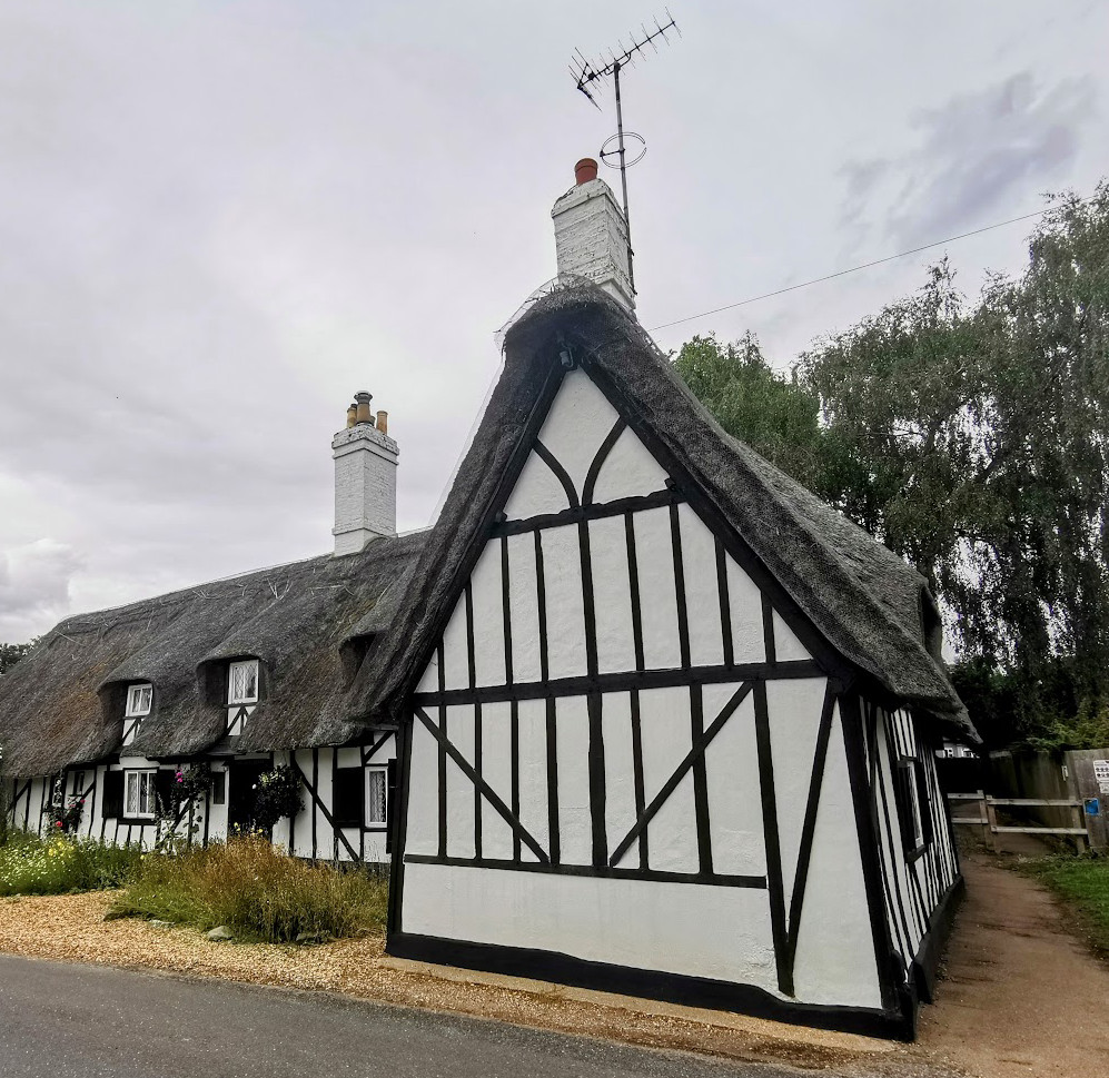 Early C17, L-plan cottage. Timber-framed, rendered and with applied mock timber- framing.
