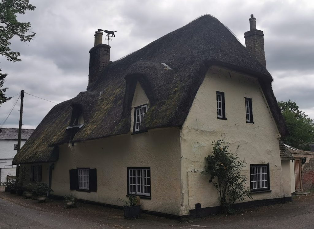 Mid-late C16 cottages of two buildings. Timber-framed, rough-cast and rendered. … Interior represented in Dendy Sadler’s “The Squire’s Song” and “The Popular Candidate”.