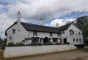 C17 Inn with earlier cross-wing, re-roofed to left hand. Two-storeys, one-storey and attic.