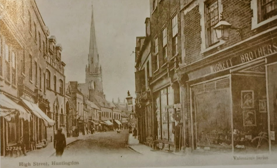 High Street, Huntingdon c.1907The photo shows the view from Market Hill south along the High Street. The spire is that of Trinity church, built in 1868 and demolished in 1968. Some of the buildings on the right of the picture survive in 2022.