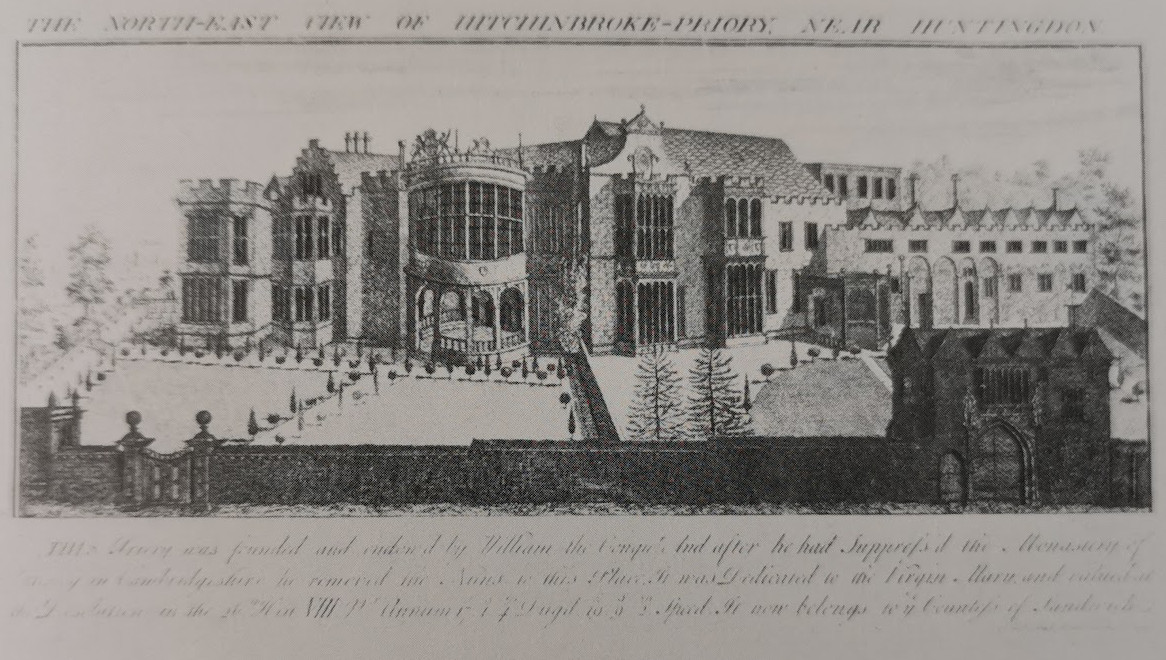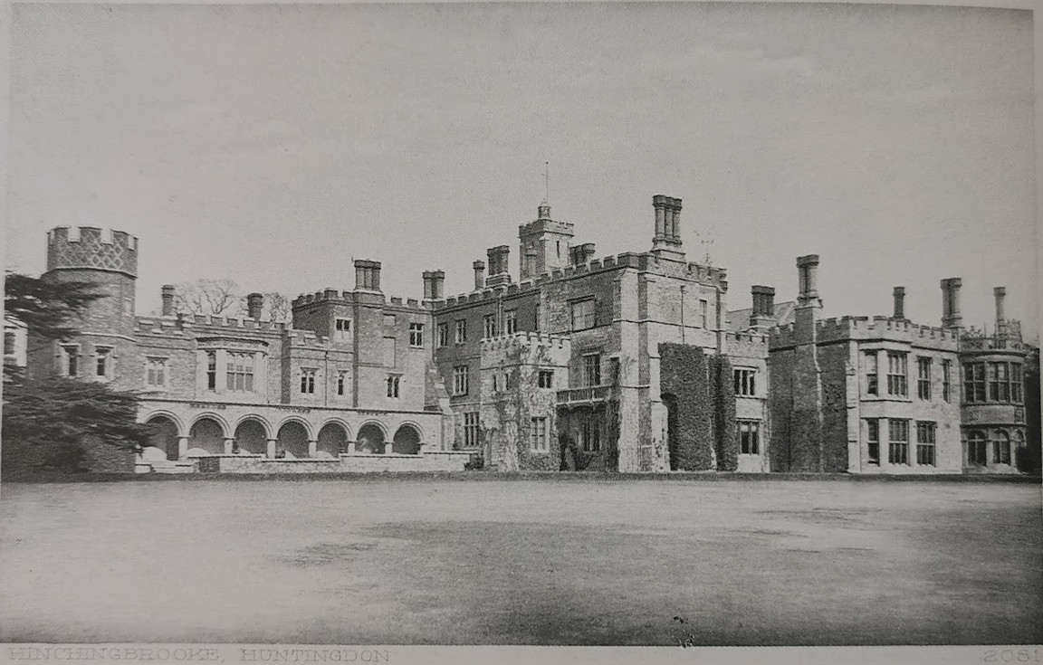 Hinchingbrooke gatehouse (Religious Houses of Cambs, 1988)Hinchingbrooke House stands on the site of a Benedictine nunnery, which occupied the site from at least 1087 until the dissolution of the priory in 1536. The remains of the priory buildings were granted to Sir Richard Williams in 1538, and were developed in the late C16 and early C17 by the Cromwells. The main approach to the house was updated in the late C16, with the relocation of a late medieval gatehouse from Ramsey Abbey to the north entrance of Hinchingbrooke Priory by Sir Henry Cromwell. The Hinchingbrooke estate was sold in 1627 to Sir Sidney Montagu, and his son Edward Montagu later became Baron Montagu of St Neots, Viscount Hinchingbrooke and Earl of Sandwich. The house at Hinchingbrooke was developed in the 1660s and an icehouse, designed by Lord Clarendon, was built in 1666 (destroyed in 1912).