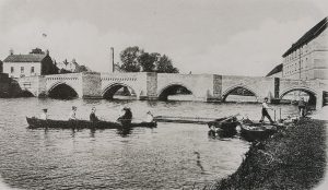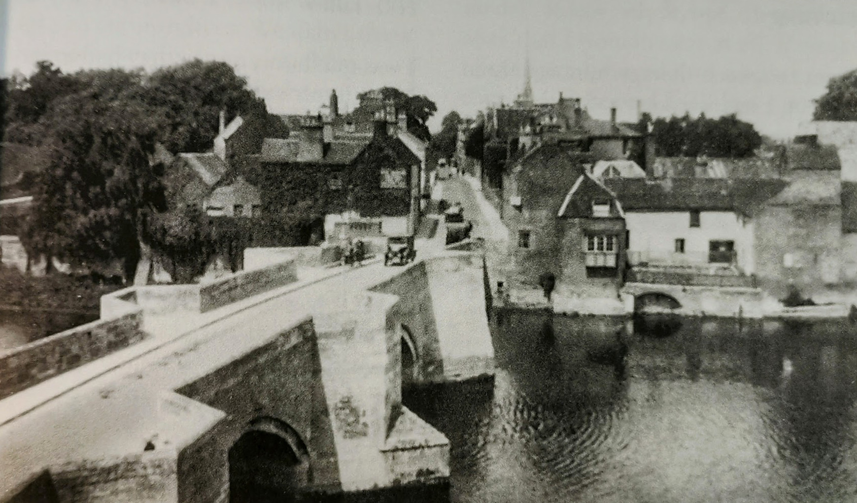 Circa 1300 but repaired over the centuries. Of stone throughout, with 6 pointed arches with cutwaters and refuges on both sides. There is a band of trefoil decoration in the form of corbelling over 2 arches these are probably the most ancient part of the bridge. A fine and famous example of a medieval bridge. The 3rd arch was replaced by a drawbridge during the Civil War.