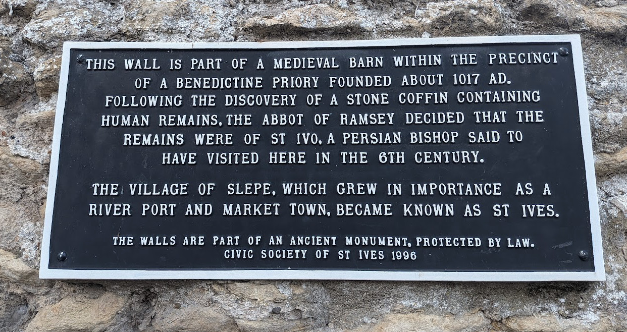 St Ives monastery barn (Religious Houses of Cambs, 1988)The monument includes the remains of a medieval barn, the standing walls of which provide the only visible evidence of the Benedictine priory at Saint Ives.