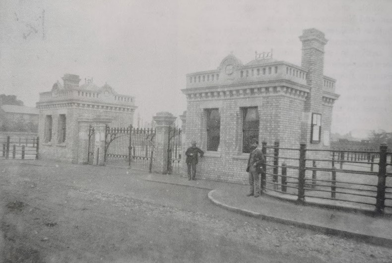 Entrance gates and lodges to Cattle Market II 2. Circa 1886. Iron gates with brick piers with stone capitals flanked by side gates.