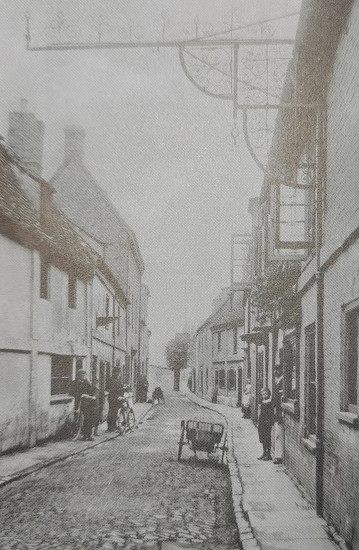 The wrought iron sign bracket originally came from the Ship Inn on the Quay. Note the tree growing in the road.