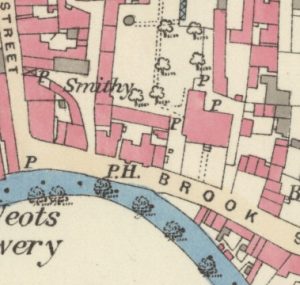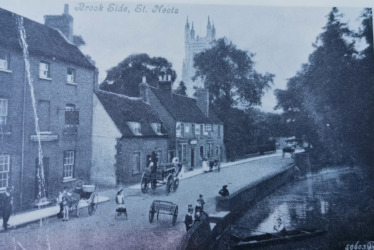 Brook Street St Neots, 1907, nos 7 - 11 in front of church tower. 'Bushel and Strike' on left