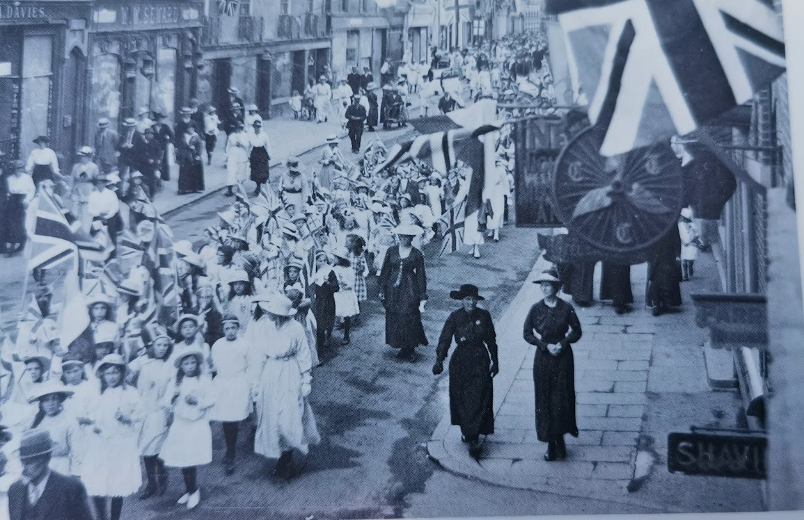 High Street, 1919, procession at end of World War One. New Inn is front right displaying Cyclists Touring Club symbol