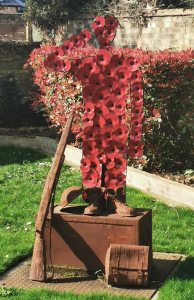 DESCRIPTION: St Neots war memorial comprises a two-tiered pillar decorated at the top with a stone collar edged with hollow dropped squares, from which hang carved floral garlands incorporating a poppy-head at the centre point.