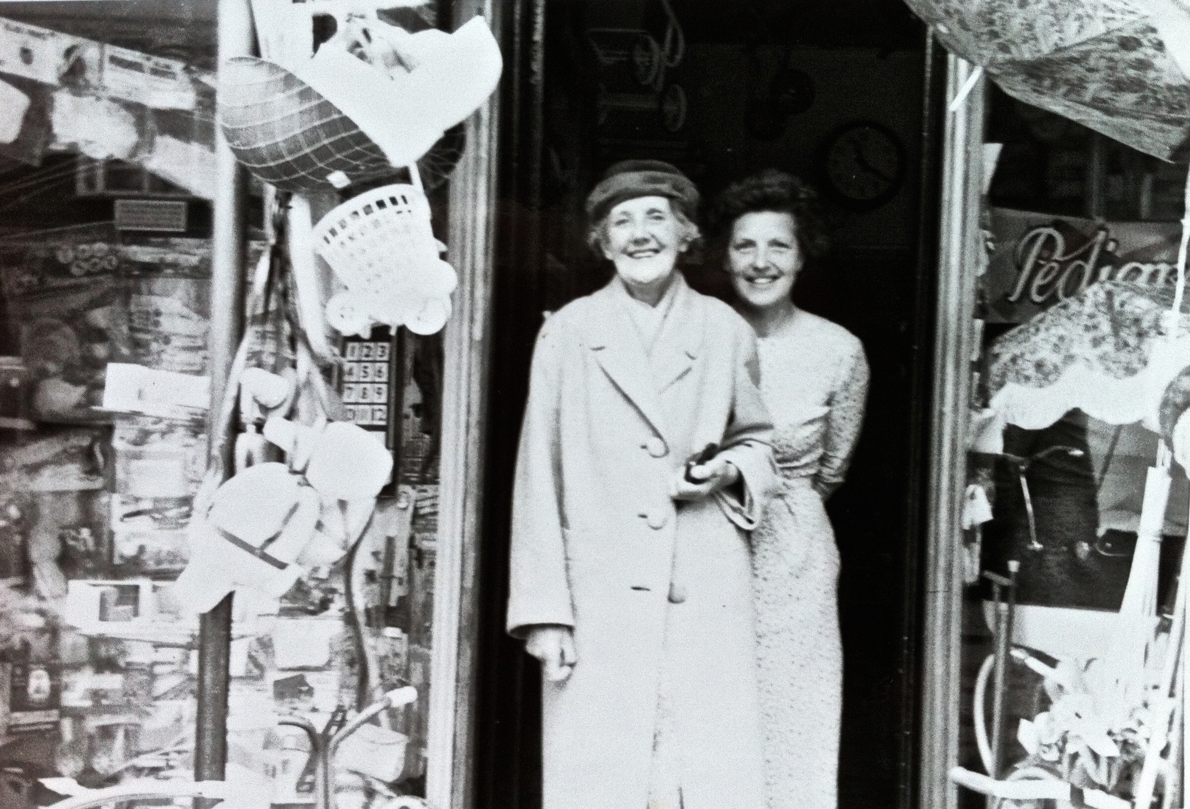 Mrs Edie Webb (left) with her daughter Millie Barraclough outside their shop at 188 Mill Road, mid 1950s.