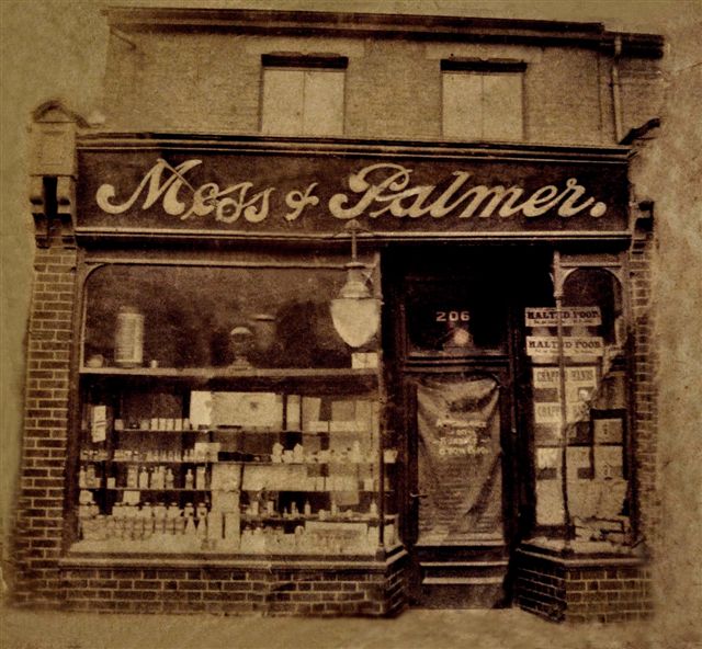 On 2 April 1902, Ernest William Moss and fellow chemist James Marsh Palmer went into business together opening a pharmacy at 210 Mill Road (BLD’s café in 2015). Mr Moss already owned another chemist shop at 121 Newmarket Road, which he continued running whilst James Palmer managed the new business. In 1907 they bought No. 206, refitted it for use as a pharmacy – using some of the fitments from No. 210 – and by 1909 had moved the business entirely.