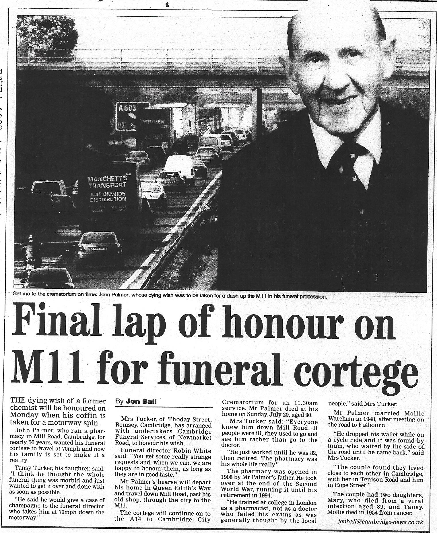 It was the dying wish of John Palmer (1913–2003) for his funeral cortège to travel at 70mph. Cambridge Funeral Services honoured his request in a trip down the M11.