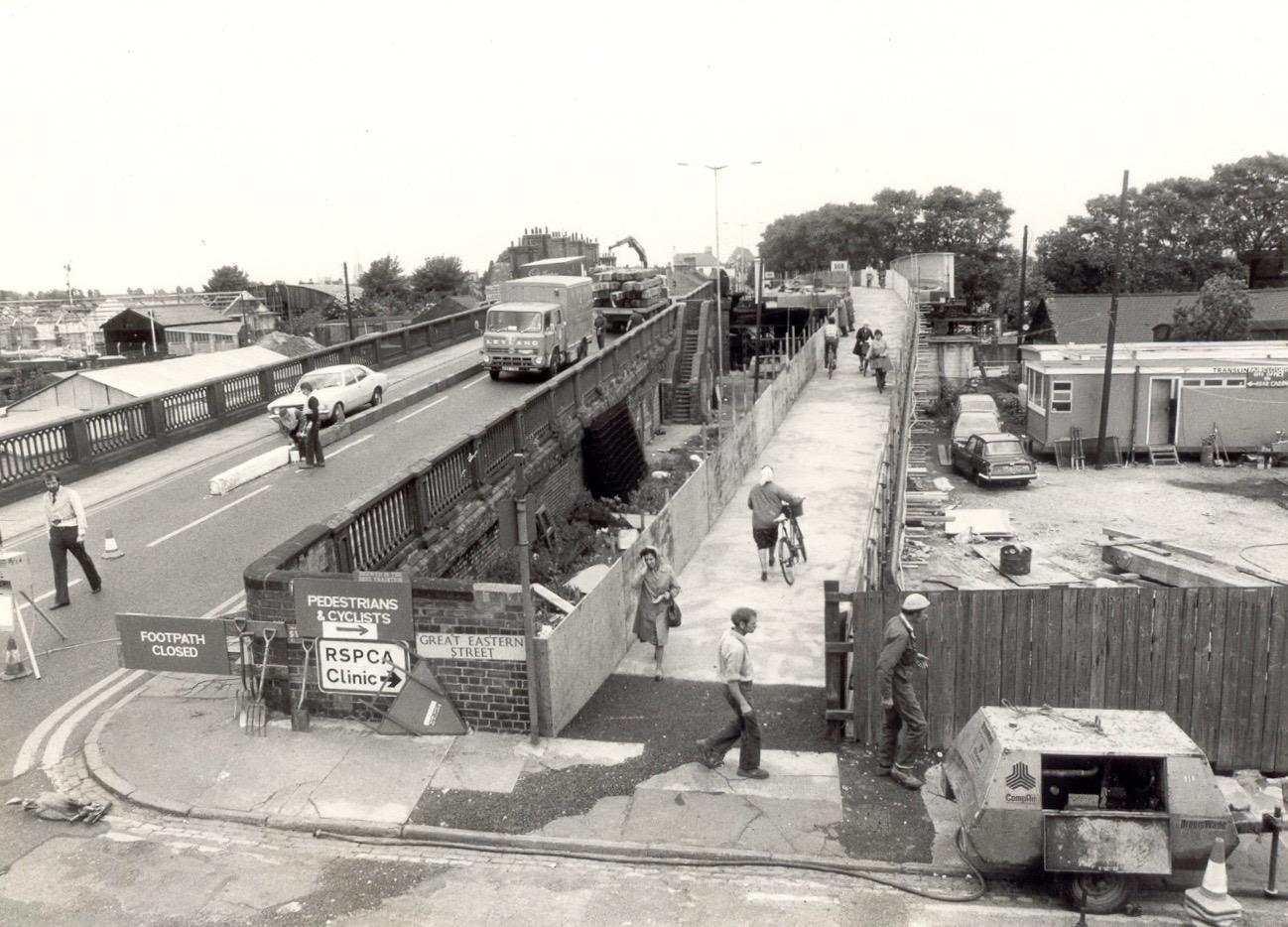 The bridge from Great Eastern Street looking towards Petersfield. Courtesy of John Hullock and the Suzy Oakes Collection.