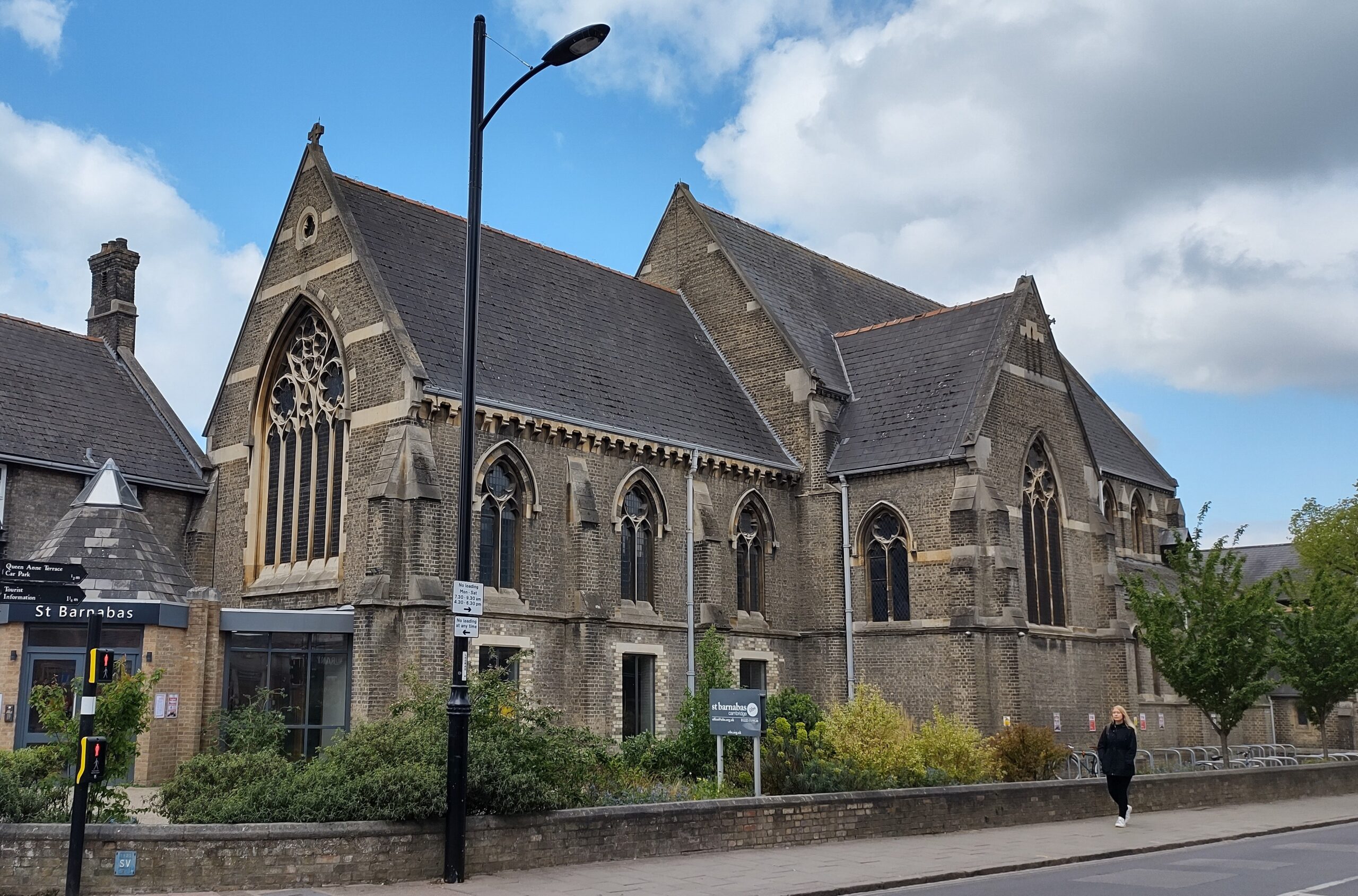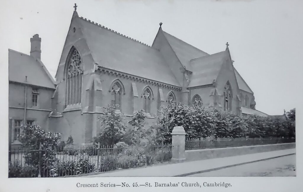 St Barnabas church Cambridge postmarked 1910The chancel was built 1869-70, the nave abd aisles 1878-87. According to Pevsner, the church is made of yellow brick and corsham stone and show a decorated tracery style reminiscent of c. 1280. The original design was for a tower and spire north of the chancel.