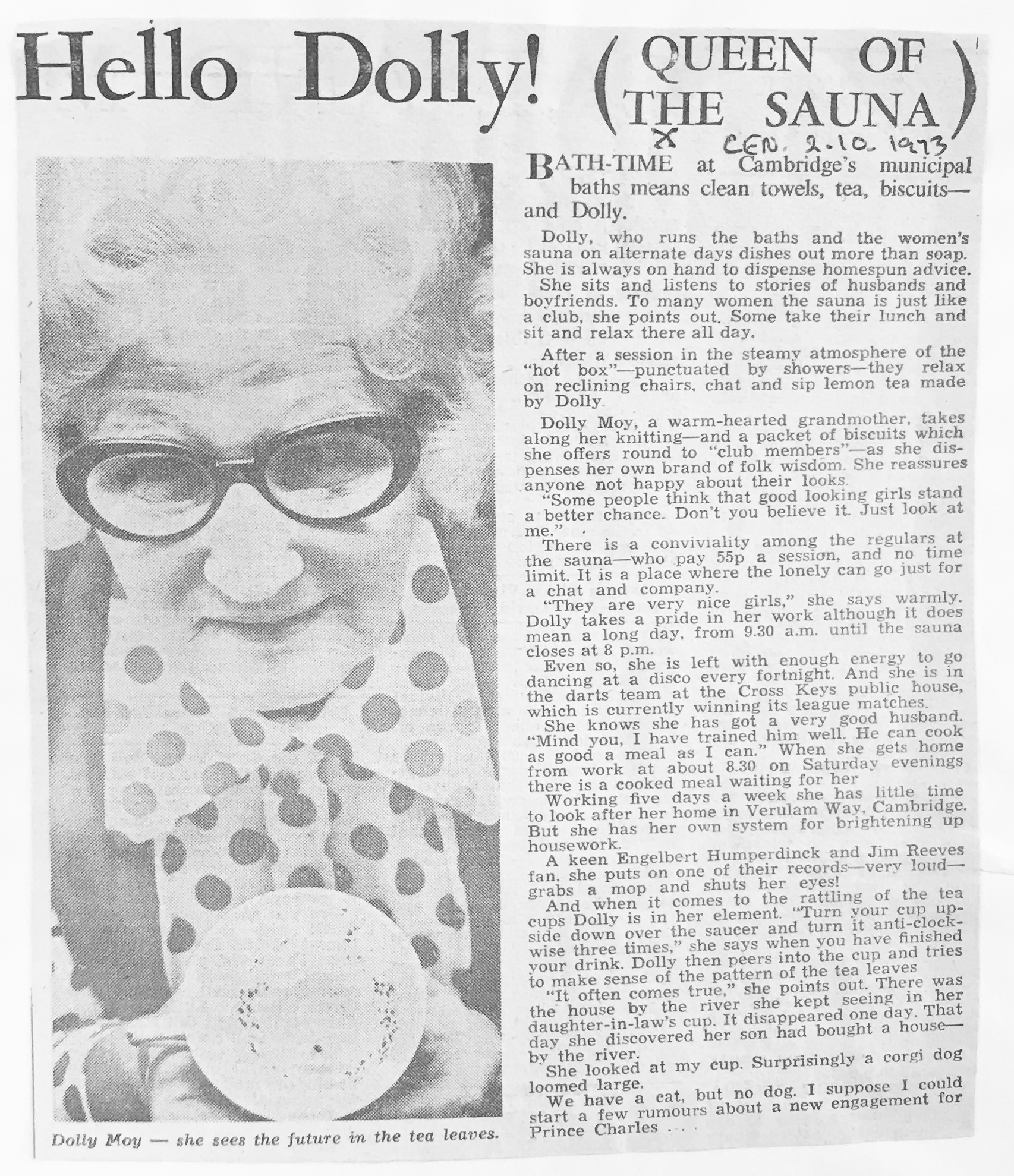 Dolly Moy who ran the municipal baths and women’s sauna in the 70’s tells the Cambridge Evening News about her work and bath-time gossip. Image courtesy the Cambridgeshire Collection.