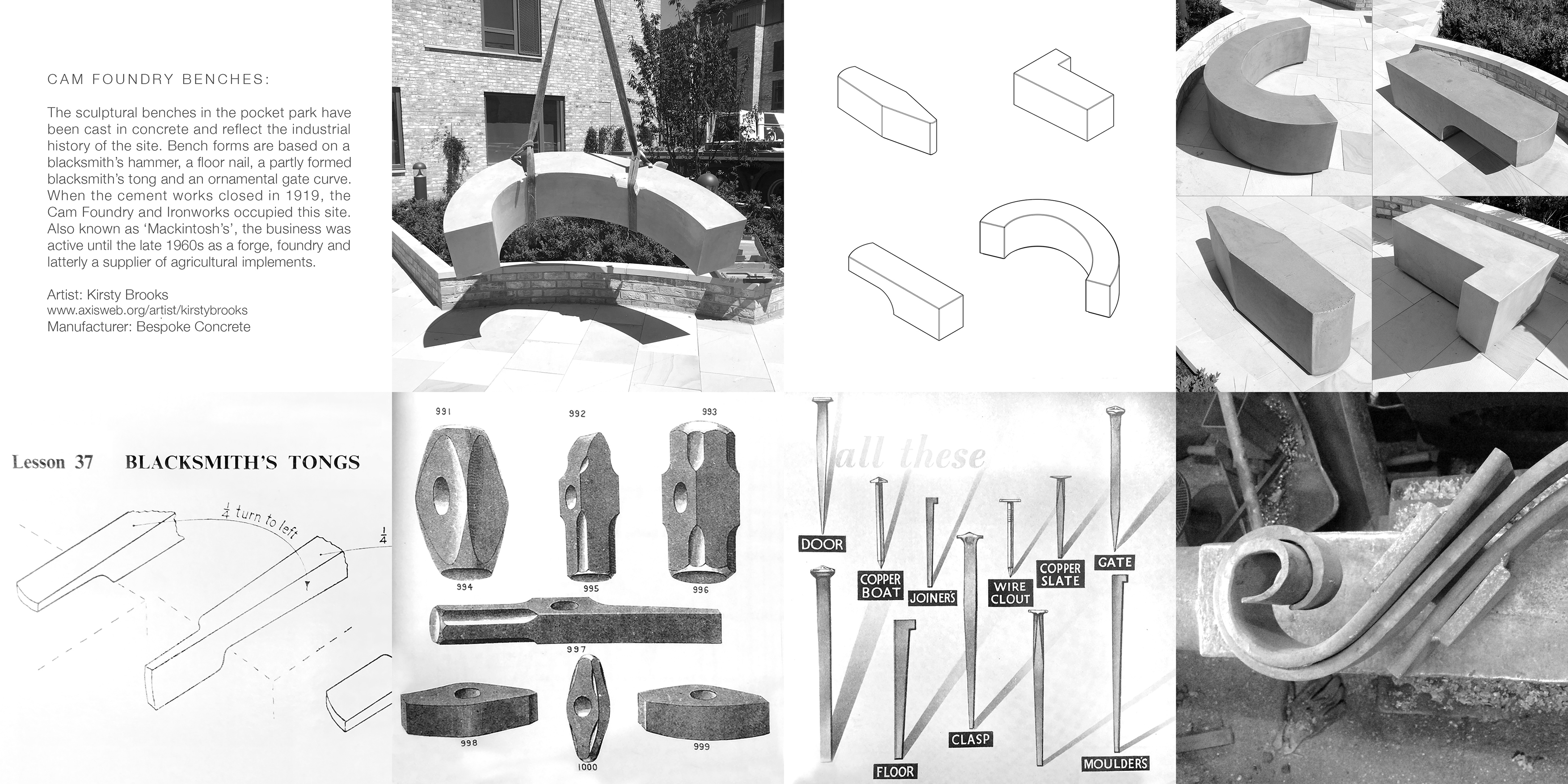 The sculptural benches in the pocket park have been cast in concrete and reflect the industrial history of the site. Bench forms are based on a blacksmith’s hammer, a floor nail, a partly formed blacksmith’s tong and an ornamental gate curve. When the cement works closed in 1919, the Cam Foundry and Ironworks occupied this site. Also known as ‘Mackintosh’s’, the business was active until the late 1960s as a forge, foundry and latterly a supplier of agricultural implements.