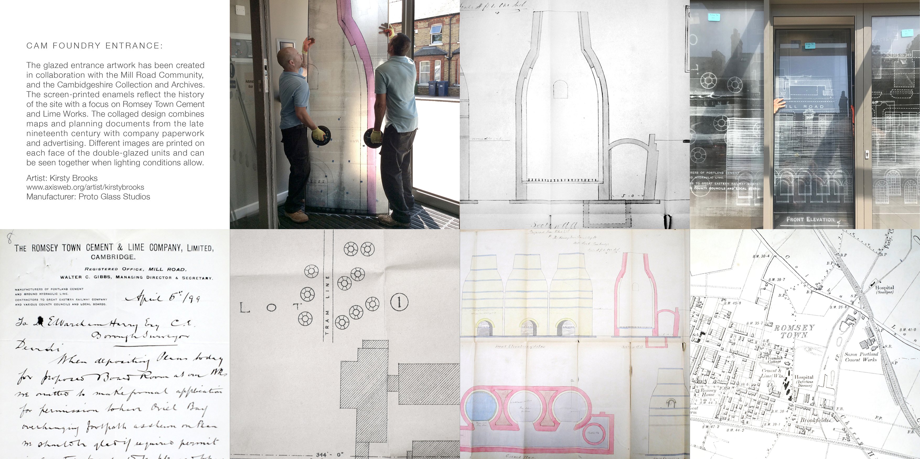 The glazed entrance artwork has been created in collaboration with the Mill Road Community and the Cambridge Collection and Archives. The screen-printed enamels reflect the history of the site with a focus on Romsey Town Cement and Lime Works. The collaged design combines maps and planning documents from the late nineteenth century with company paperwork and advertising. Different images are printed on each face of the double-glazed units and can be seen together when lighting conditions allow.