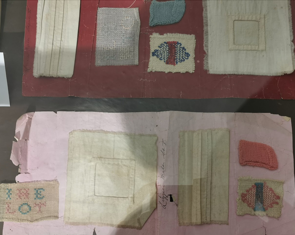 Lizzie Male, a student at Cottenham School in 1892 made these needlework samples. The piece shows delicate skills in some small samples, keeping to a colour scheme of white blue and red. The red-backed piece from left to right shows needle-turned appliqué, weaving, knitting, cross-stitching and pleating, most likely using a smock machine. The pink backed piece shows weaving, knit, smocking, needle-turned appliqué and cross stitching.