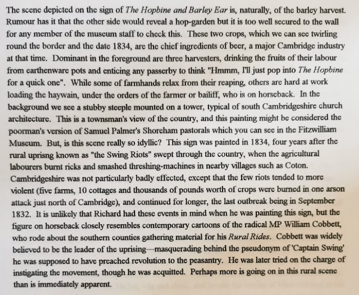 The Hopbine and Barley Ear signed displayed at the Museum of Cambridge is by Richard Hopkins Leach, 1794 – 1851.  It shows three agricultural workers sharing a barrel of beer; on the reverse is a hop garden.