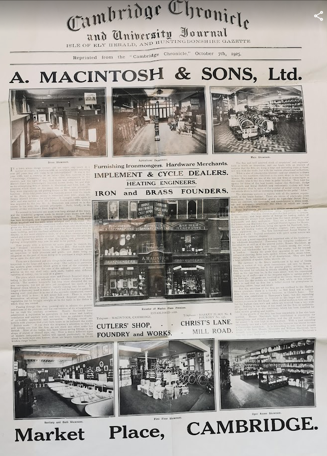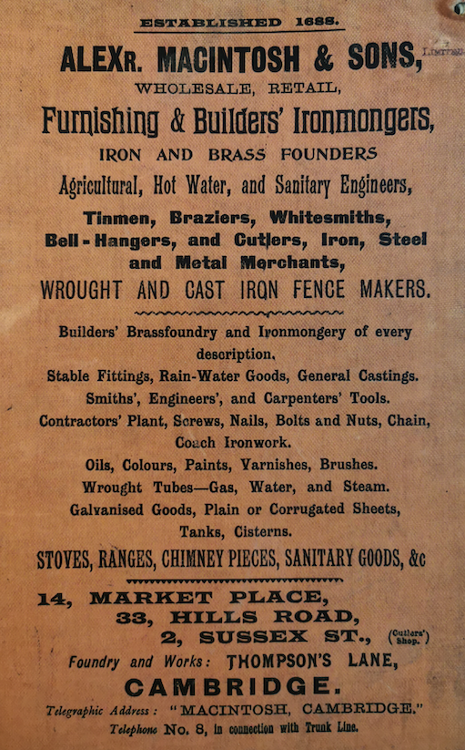 Alexander Macintosh bought the bankrupt ironmongery business of Edward Beales and moved to 14 Market Hill. They already had premises at 21 and 23 Market Street, 2 Sussex Street, 49 Sidney Street and 54a Hills Road. At about this time they also bought the Thompson’s Lane Foundry.