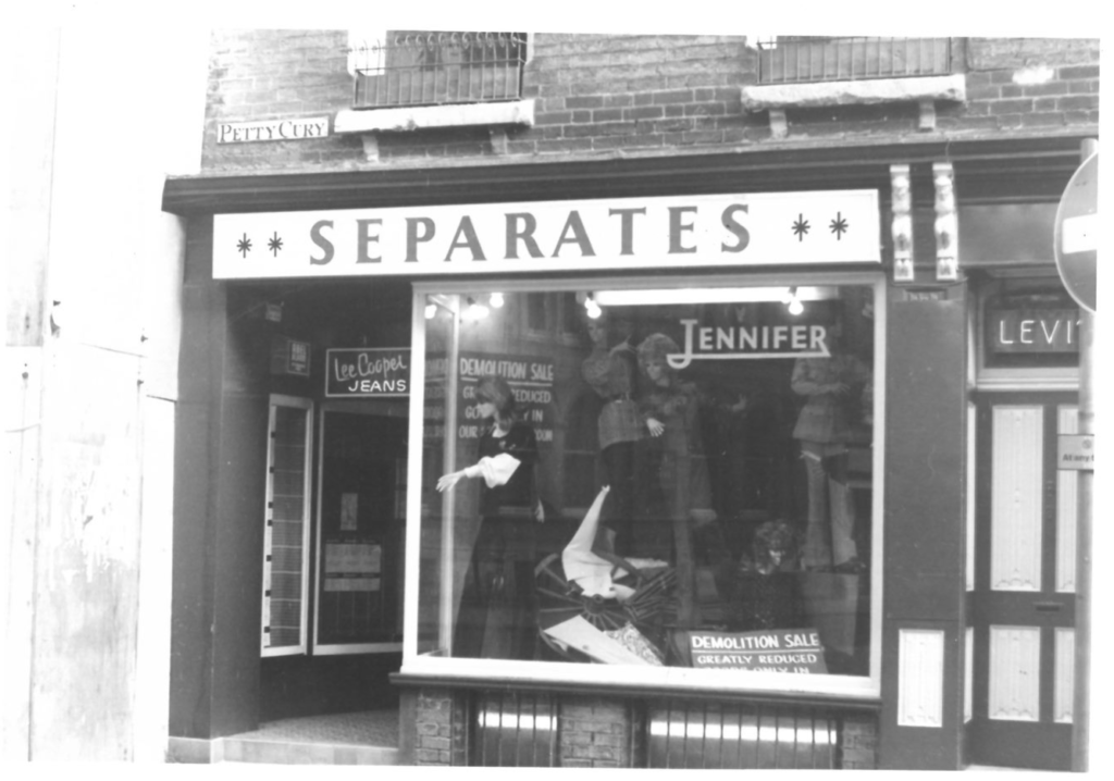 A note on the reverse of this photo states: Photograph of all four pinewood figures which were placed above each side of the fascia of 17 Petty Cury which was demolished in September 1972. The figures seemed to have replaced the carved negro heads which belonged to J Kittridge tobacconists. Photograph by Edward Leigh, King’s Parade, after the carvings were removed to the Guildhall. Neg No. C33073.