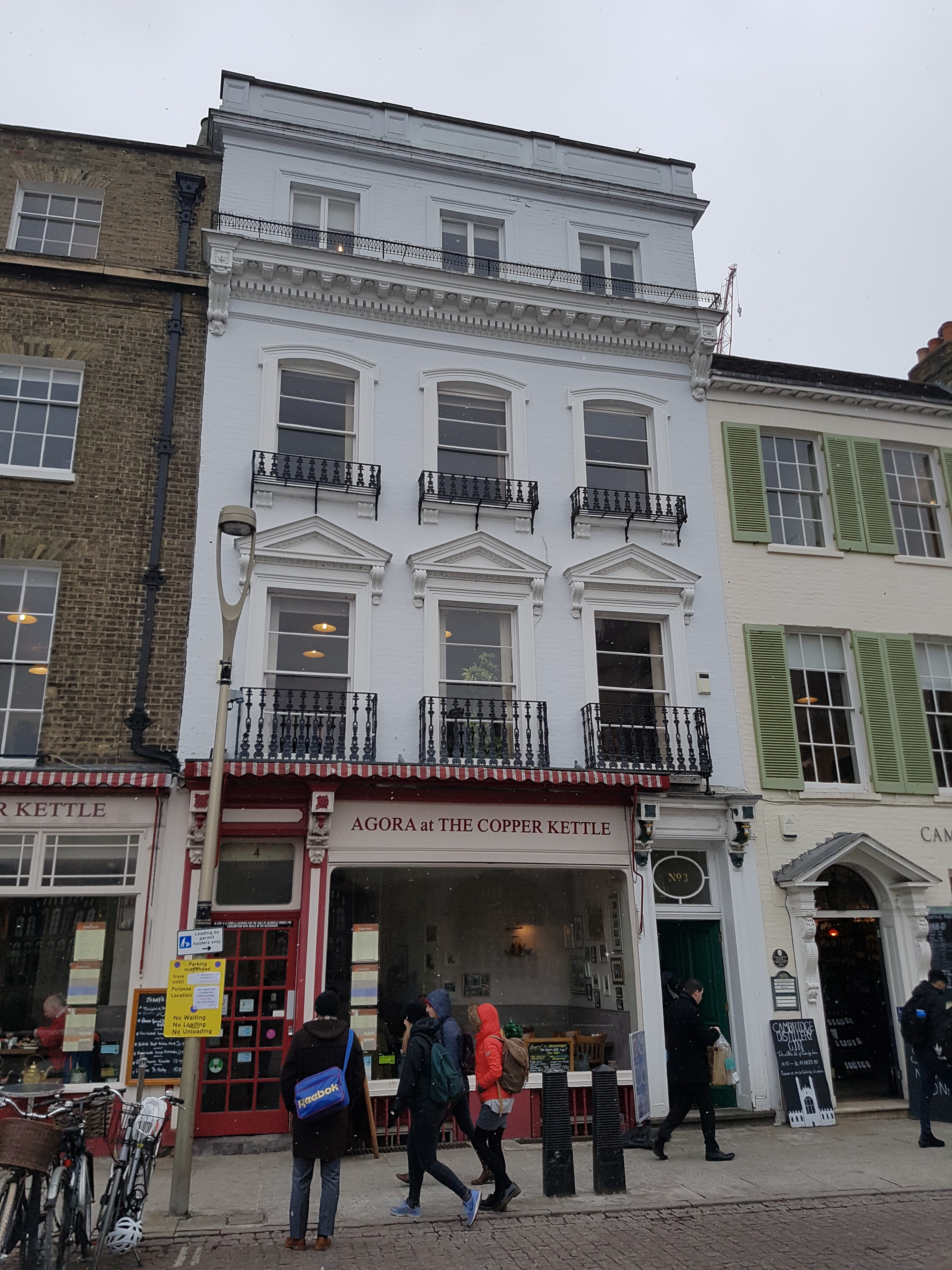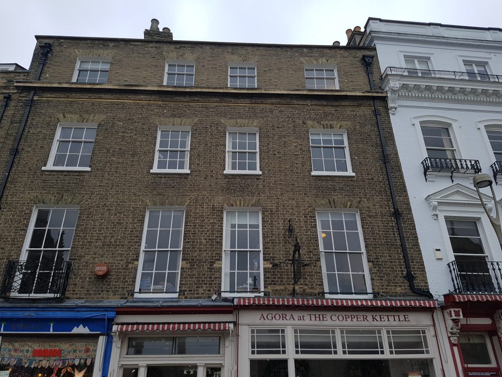 Nos 4, 4a and 5 is of four storeys. Cast in the heads of the two rainwater downpipes on the west is the date 1834, the probable date of the building. The wide doorway off centre is original but has been moved. A stone above is inscribed C.C.T.G. probably for Greef, a plumber, who lived here.