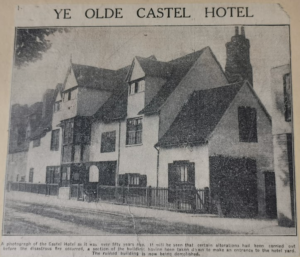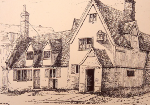 Leaving the old barn and the memories  its story revives, we came to the Three Tuns, the curious old publichouse on Castle-hill, opposite to the gates of the Shire Hall, which inevitably attracts the attention of visitors. The house has recently passed into the possession of the Cambridge Corporation. From this inn Elizabeth Woodcock started on her return to Impington, when she was overwhelmed in a snowstorm. It was used by Pepys when he came from London to Cambridge in 1659-60, and the fact was duly recorded in the famous diary. But what is not so well known, and may be more to the popular fancy, is the fact that it was one of the houses of call of that notorious character Dick Turpin, who, we are told, used to sleep in a room at the top of building at the back of the Inn, which has just been destroyed in the course of some alterations and improvements that are being carried out. In outward appearance the old Inn remains unaltered, and there are many quaint nooks and corners and curious staircases, which tell their own story of other days and other habits. There is another old public house in the town which is said to have been used by Dick Turpin, the Old Red Lion in Bridge-street, which possesses a fine old carved mantel. Among other old places visited may be mentioned the Old Cross Keys Inn yard in Bridge-street, now occupied by Messrs. Bird as a vinegar brewery, and the old “White Horse” Inn, at the foot of Castle Hill, which has in the chimney of the sitting room a space it is thought was used as a hiding hole.
