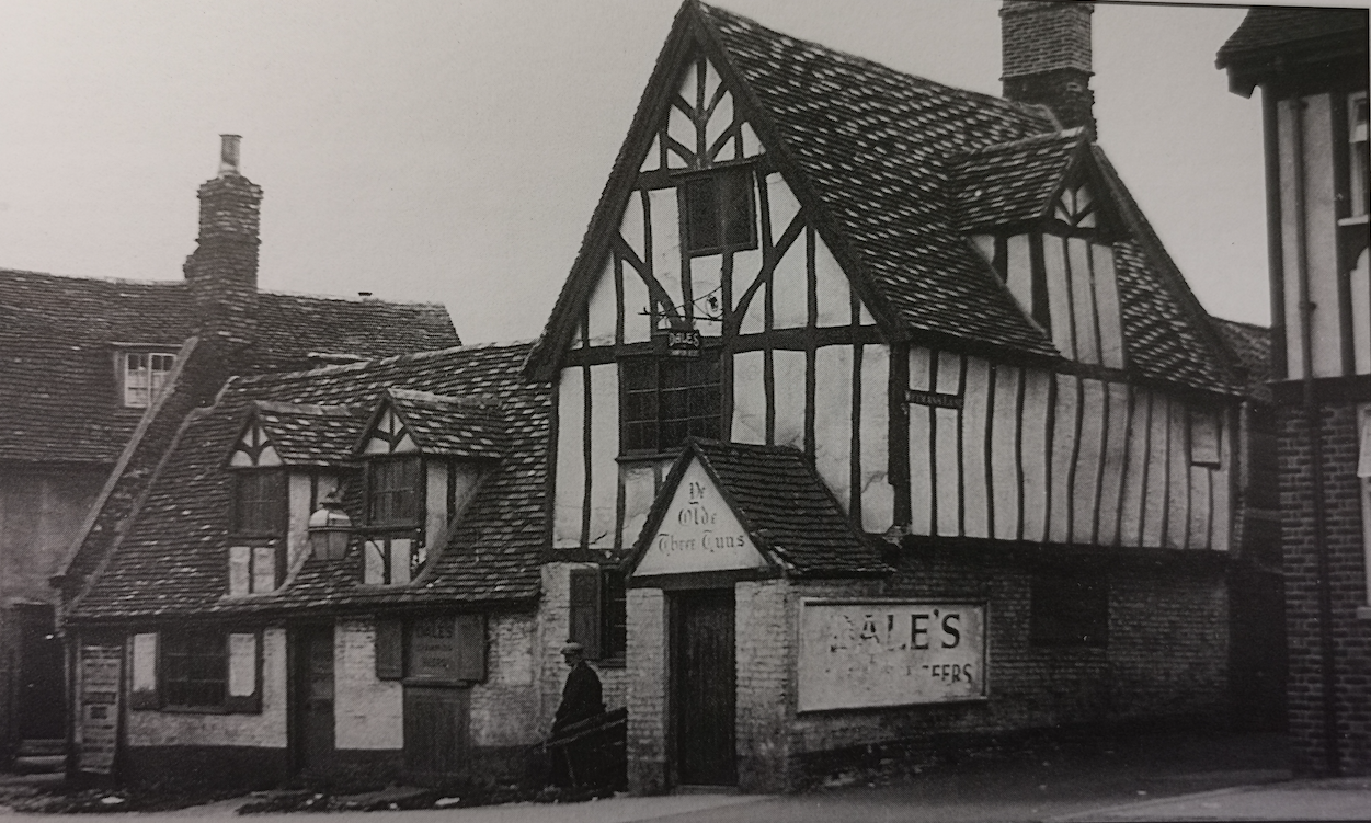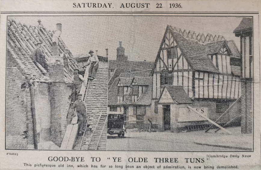 Vanishing Cambridge by Mike Petty notes: In 1907 members of the Antiquarian Society were told: It was probably built about Christmas 1685 when it was leased to William Sell and known as the Three Tuns for the first time in 1754. … They saw a letter of 1739 said to be from the landlord re his [Dick Turpin’s] effects.