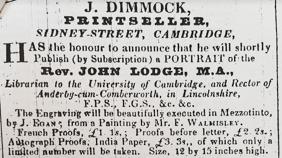 James Dimmock, 60, perfumer and printseller, b Cambridge