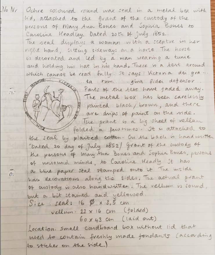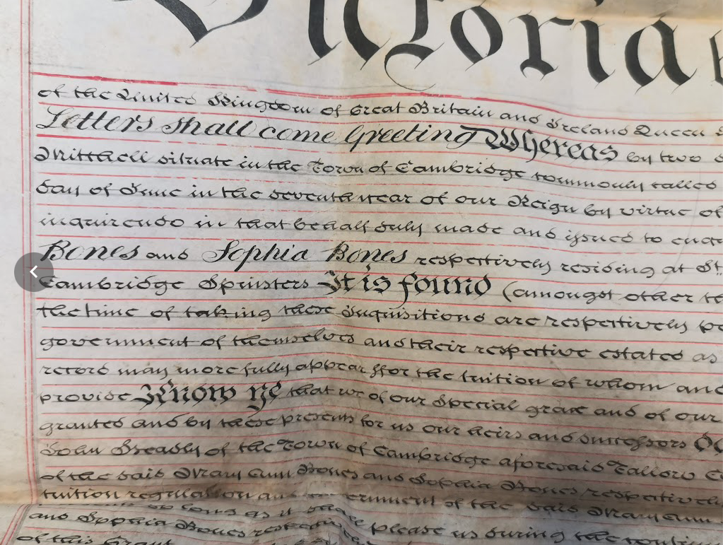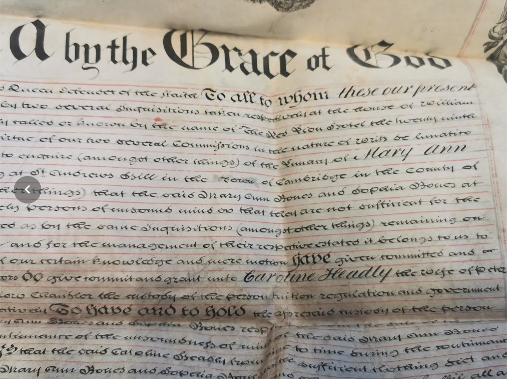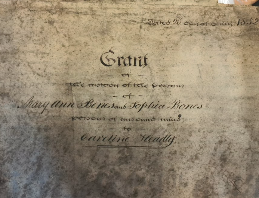1852: Grant of the custom of the persons of Mary Ann Bones and Sophia Bones persons of unsound mind to Caroline Headly