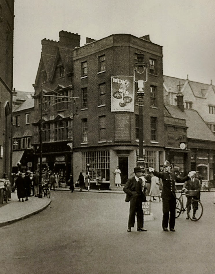 Junction of Petty Cury and Sidney Street in 1938. Police Constable Jeffrey Saddington (Cambridgeshire Collection)