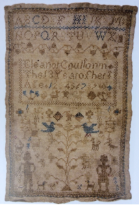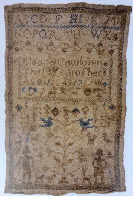 The oldest sampler (CAMFK 98.51 ) bears the name Eleanor Coulson and the detail that she stitched it at the age of 13. Besides the alphabet and name and a typical row of strawberries, this Eleanor stitched an intricate biblical scene of Adam and Eve and the Tree of Knowledge in the bottom half. The Museum Accession Register suggests that the sampler was made around 1800.