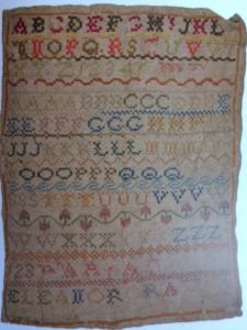 The second sampler (CAMFK 99.51) has the name Eleanor Gray but no date or age of maker. Its suggested date is 1830. The sampler is simpler in design but uses a broader colour palette. The letters of the alphabet are repeated as if in practice for future writing.