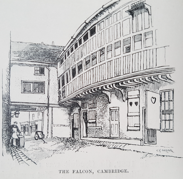 The Falcon, CambridgeFalcon Yard was a lane that ran from Petty Cury to St Tibb’s Row. The Falcon inn was in existence in the 16th century. Queen Mary saw ‘a play at the Fawcon Inn’ in 1557. Lord North stayed at the ‘Falcon’ during the reign of Elizabeth I.