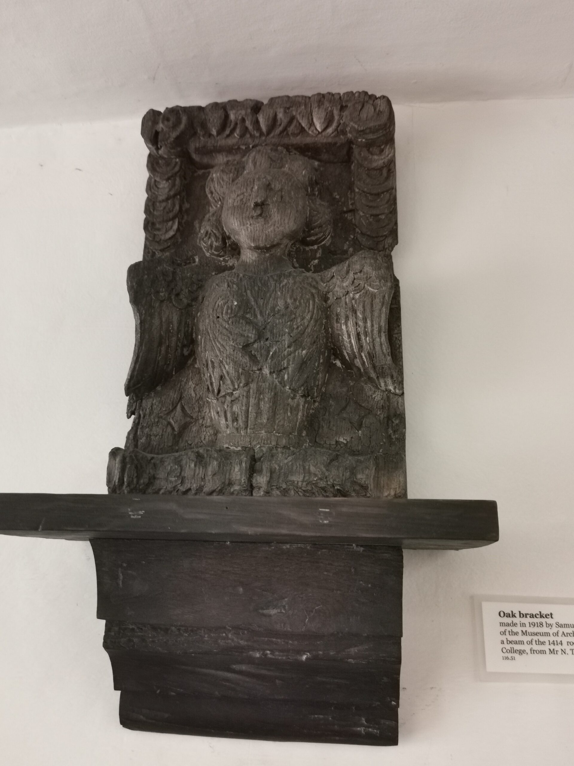 Oak bracket made in 1918 by Samuel Cowle of the Museum of Archaology, Cambridge from a beam of the 1414 roof of the hall of Caius College, from Mr N Tuelon Porter (MoC)