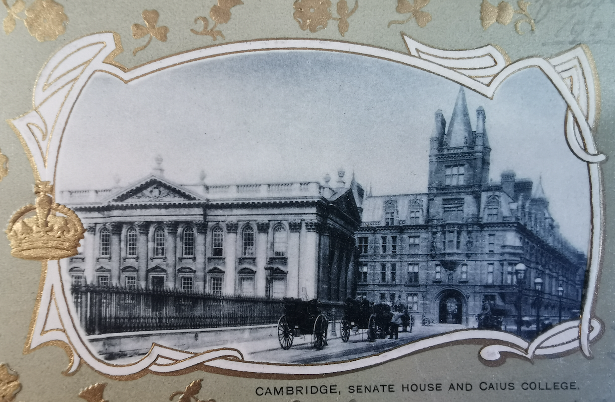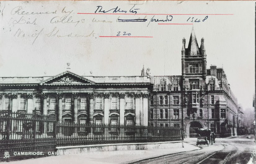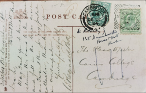 Rather cryptic postcard sent to be forwarded back by the Master of Gonville and Caius: