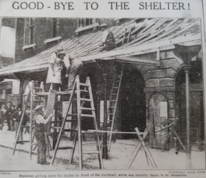 11/8/1933 The veranda or shelter over the main entrance of the Guildhall was disgustingly dirty and unsafe and should be removed, the Surveyor reported. It had been built in 1878 and the public should get used to the Guildhall without it because it would not be incorporated in the new building. Others said it was a useful shelter and should be maintained at all costs: the Preservation Society would be shocked if they allowed that ancient piece of architecture to be scrapped. (Cam.News)
